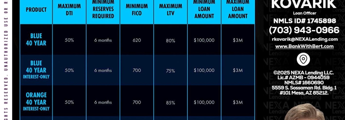 40 YR. OPTIONS - Robert Kovarik -Mortgage Loan OriginatorHi, my name is Robert Kovarik. I’m a Loan Officer with NEXA Lending LLC., offering personalized mortgage solutions, fast customized quotes, great rates and service with integrity.