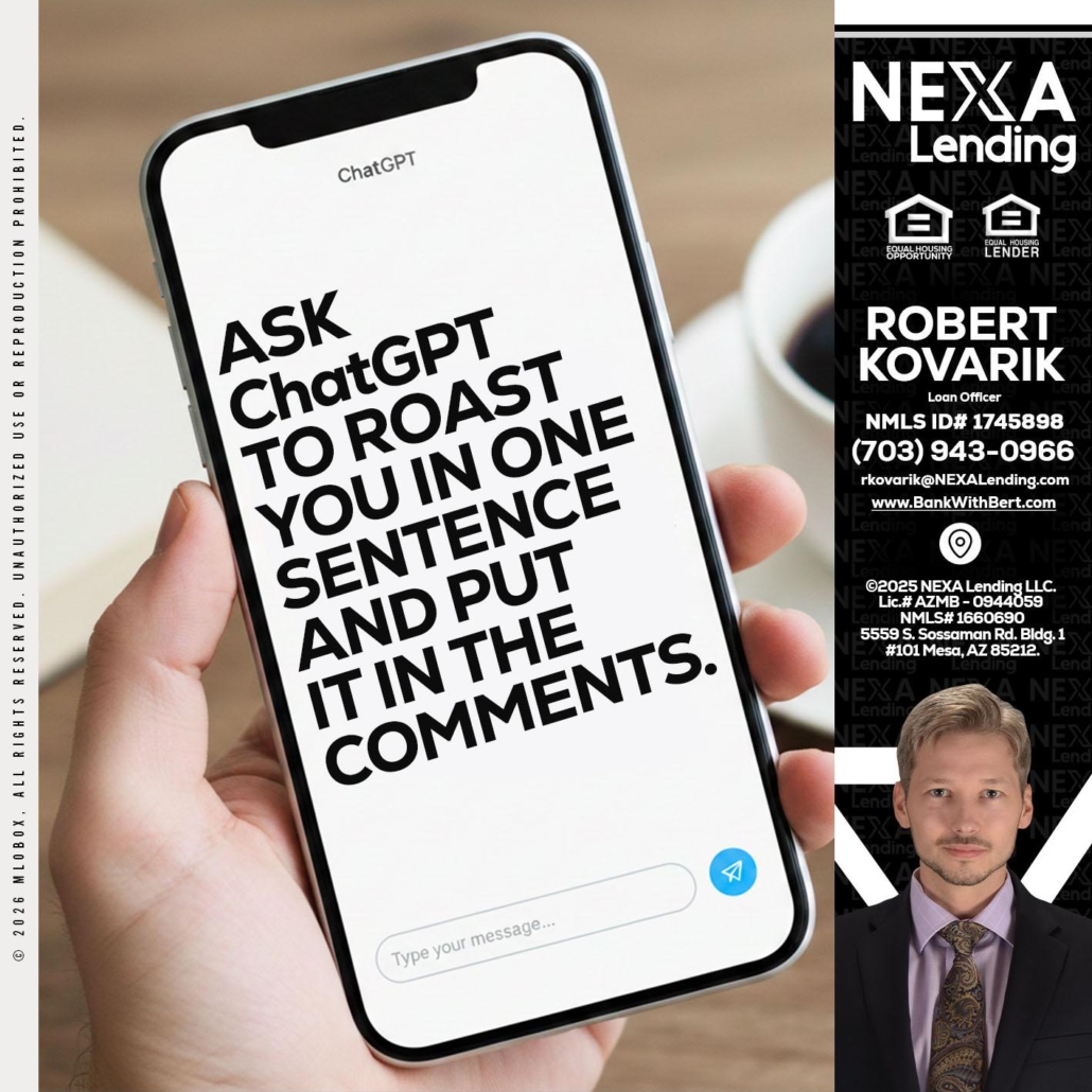 ask chatgpt - Robert Kovarik -Mortgage Loan OriginatorHi, my name is Robert Kovarik. I’m a Loan Officer with NEXA Lending LLC., offering personalized mortgage solutions, fast customized quotes, great rates and service with integrity.