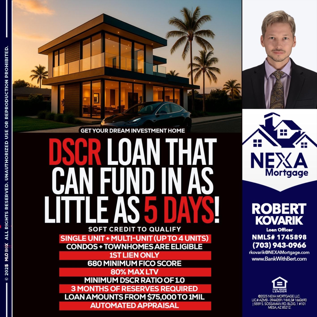 DSCR LOAN - Robert Kovarik -Mortgage Loan OriginatorHi, my name is Robert Kovarik. I’m a Loan Officer with NEXA Mortgage LLC., offering personalized mortgage solutions, fast customized quotes, great rates and service with integrity.