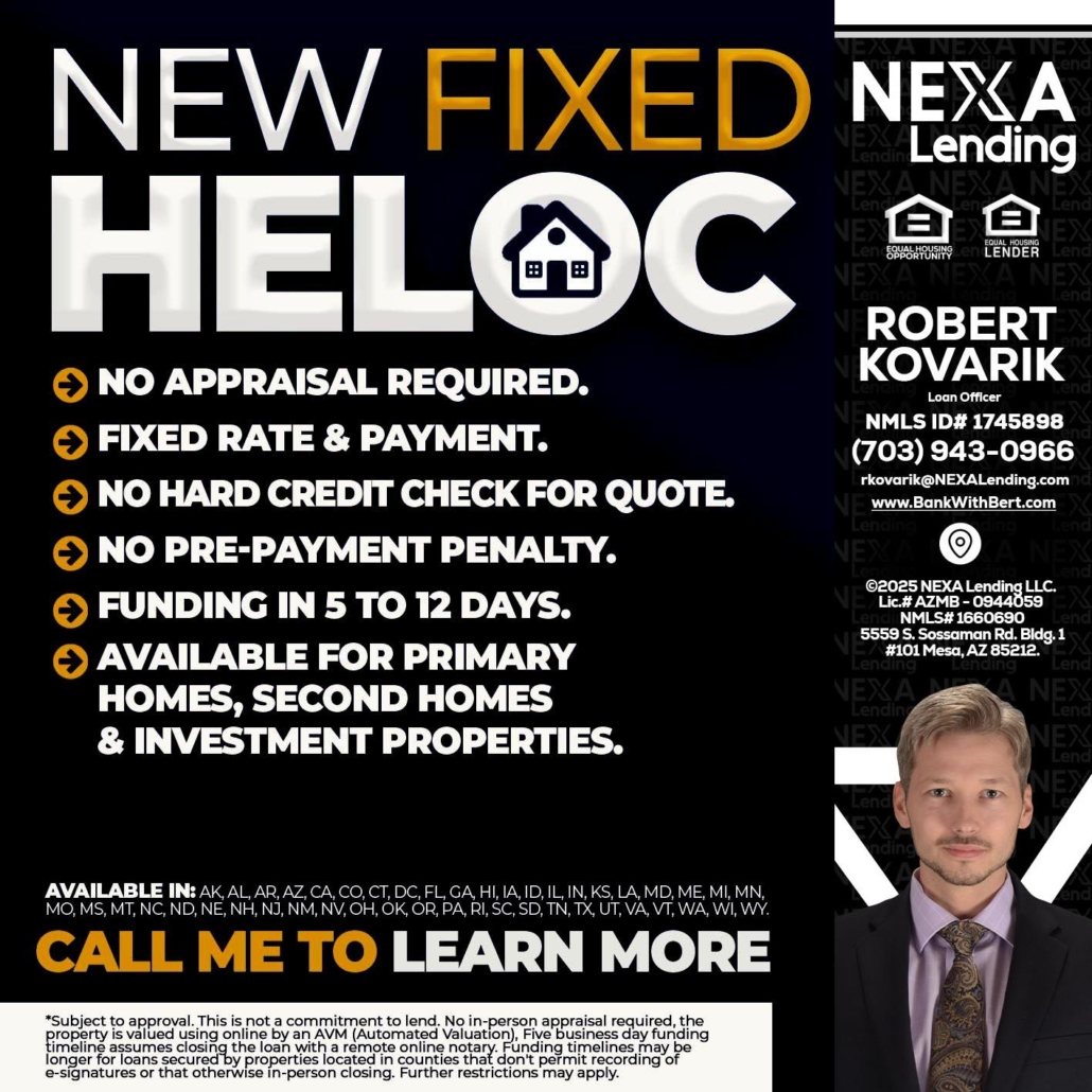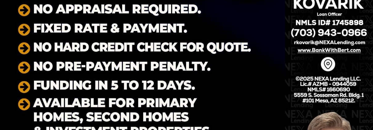 Hi, my name is Robert Kovarik. I’m a Loan Officer with NEXA Lending LLC., offering personalized mortgage solutions, fast customized quotes, great rates and service with integrity.