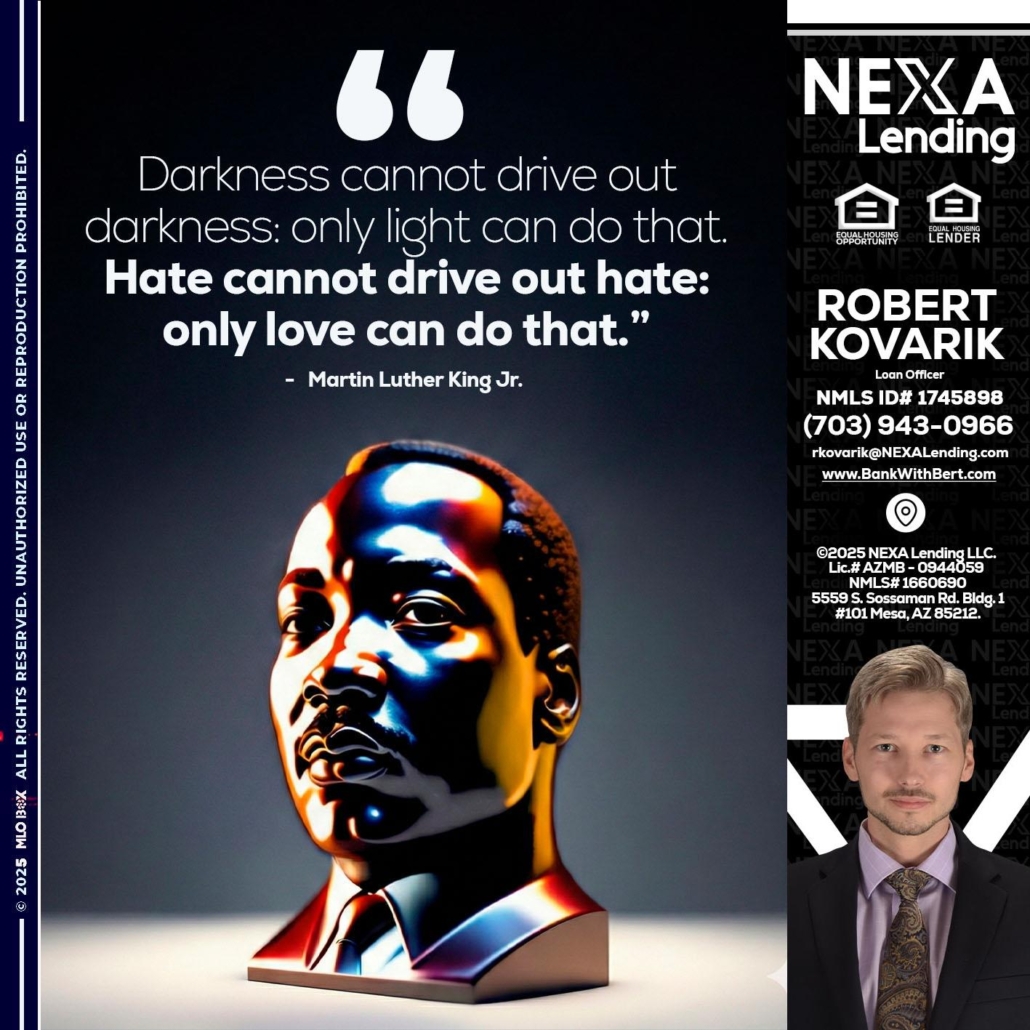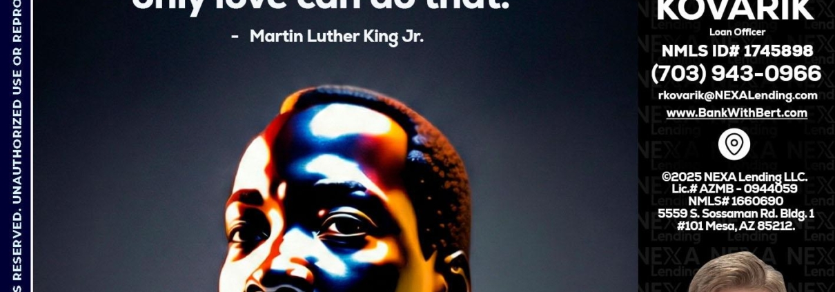 MLK 2026 - Robert Kovarik -Mortgage Loan OriginatorHi, my name is Robert Kovarik. I’m a Loan Officer with NEXA Lending LLC., offering personalized mortgage solutions, fast customized quotes, great rates and service with integrity.