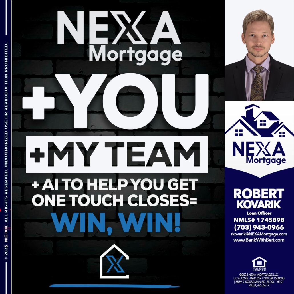 NEXA + YOU + MY TEAM - Robert Kovarik -Mortgage Loan OriginatorHi, my name is Robert Kovarik. I’m a Loan Officer with NEXA Mortgage LLC., offering personalized mortgage solutions, fast customized quotes, great rates and service with integrity.