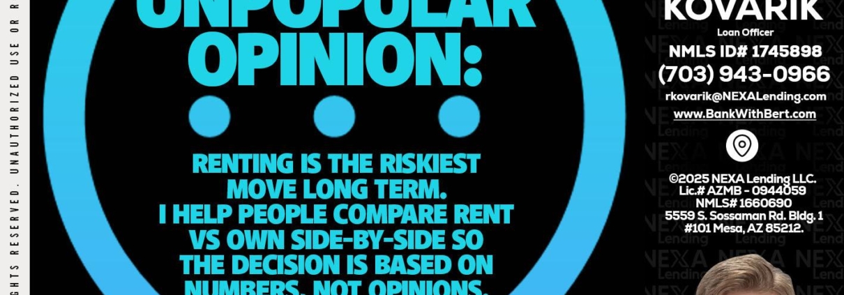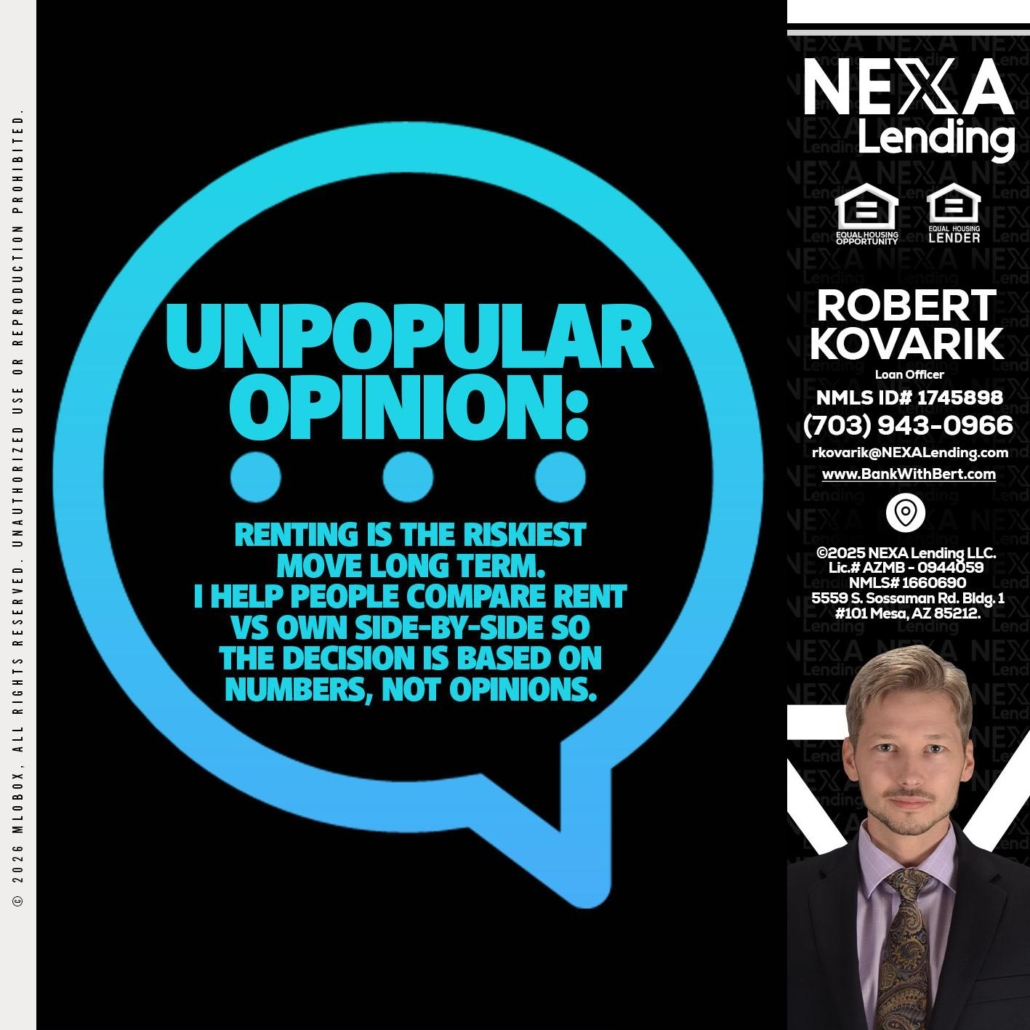 unpopular opinion - Robert Kovarik -Mortgage Loan OriginatorHi, my name is Robert Kovarik. I’m a Loan Officer with NEXA Lending LLC., offering personalized mortgage solutions, fast customized quotes, great rates and service with integrity.