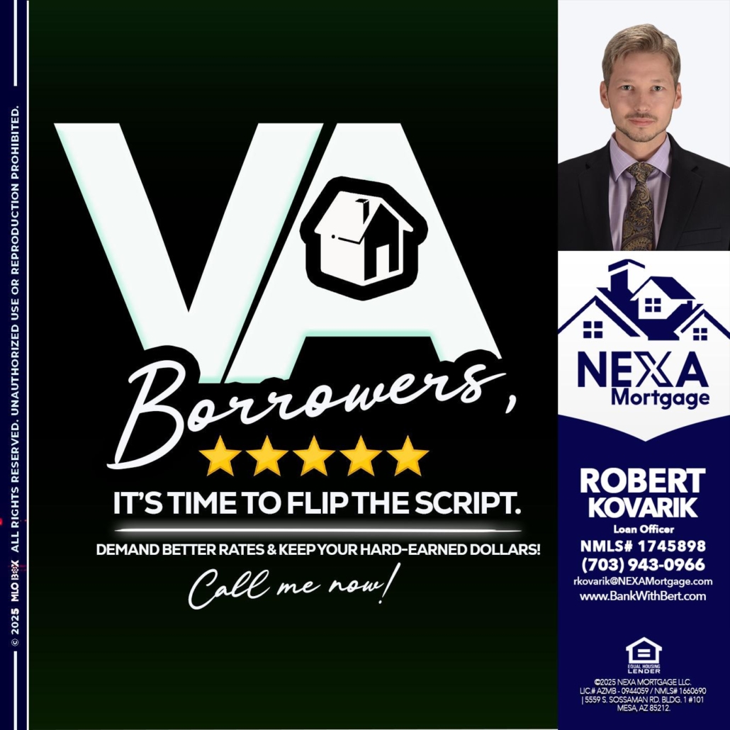 VA BORROWERS - Robert Kovarik -Mortgage Loan OriginatorHi, my name is Robert Kovarik. I’m a Loan Officer with NEXA Mortgage LLC., offering personalized mortgage solutions, fast customized quotes, great rates and service with integrity.