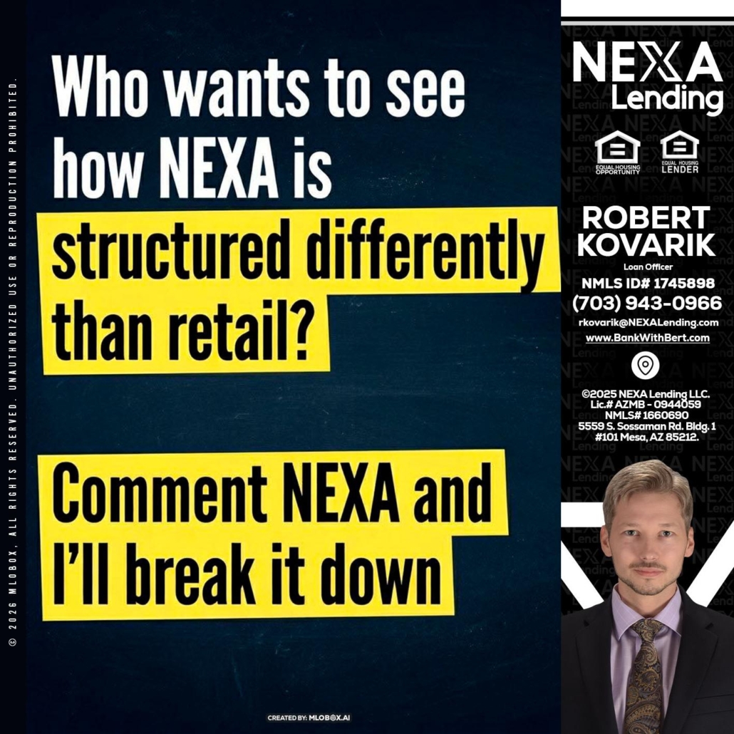 who want to see - Robert Kovarik -Mortgage Loan OriginatorHi, my name is Robert Kovarik. I’m a Loan Officer with NEXA Lending LLC., offering personalized mortgage solutions, fast customized quotes, great rates and service with integrity.