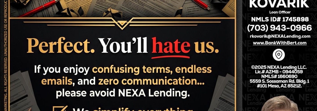 Hi, my name is Robert Kovarik. I’m a Loan Officer with NEXA Lending LLC., offering personalized mortgage solutions, fast customized quotes, great rates and service with integrity.